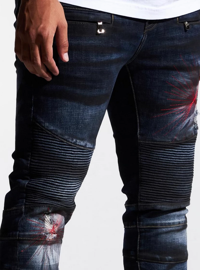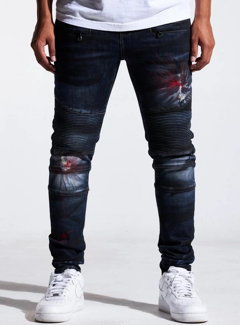 Crysp Denim uses premium quality materials that are built to last. They feature biker designs with a standard zip fly closure.