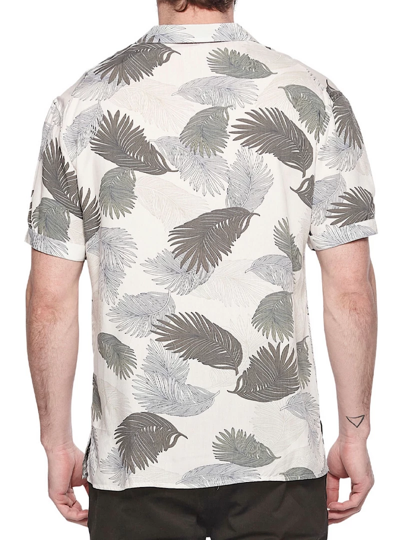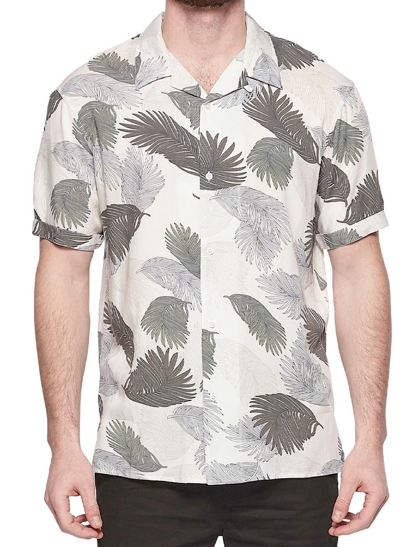 Tropical palm trees underscore the breeze-ready appeal of a camp shirt styled for enjoying sunny days in the comfort of soft, lightweight viscose.