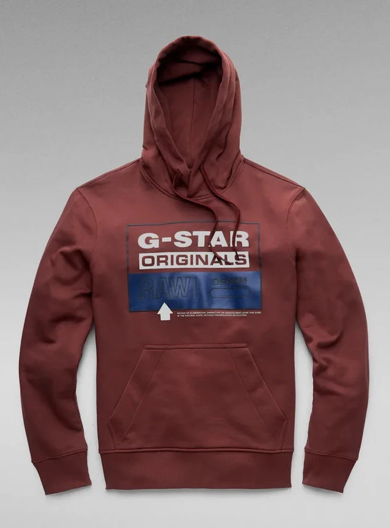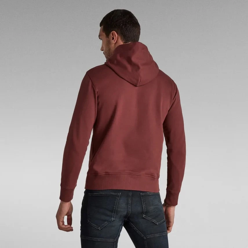 Hoodie PM features a sewn in kangaroo pocket with broad welt entries, executed in a contrast material. The hood offers a cross over construction and woven drawstrings. Long sleeves are finished with a ribbed edge and show a shiny woven overlay panel at the biceps. The pull cord at the waist allows for a close fitted edge. The G-Star RAW badge at the chest signs this hoodie.
