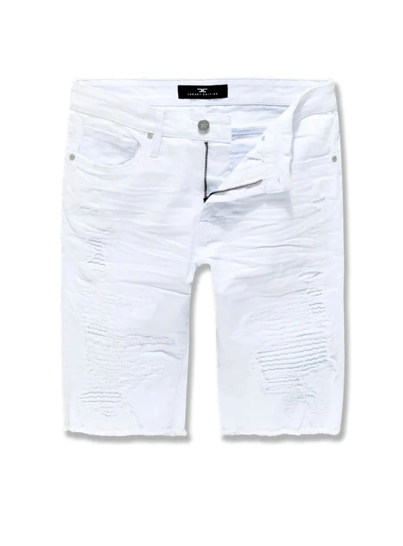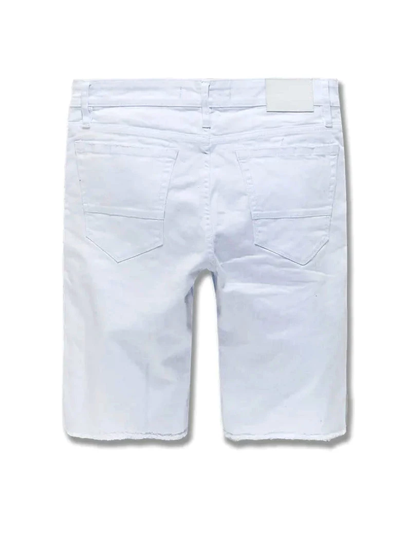 - These Jordan Craig Shorts Feature Regular rise, Classic stone wash, Rip and repair design back with dark blue raw denim backing, Unique distressing on each pair and Deep front pockets.