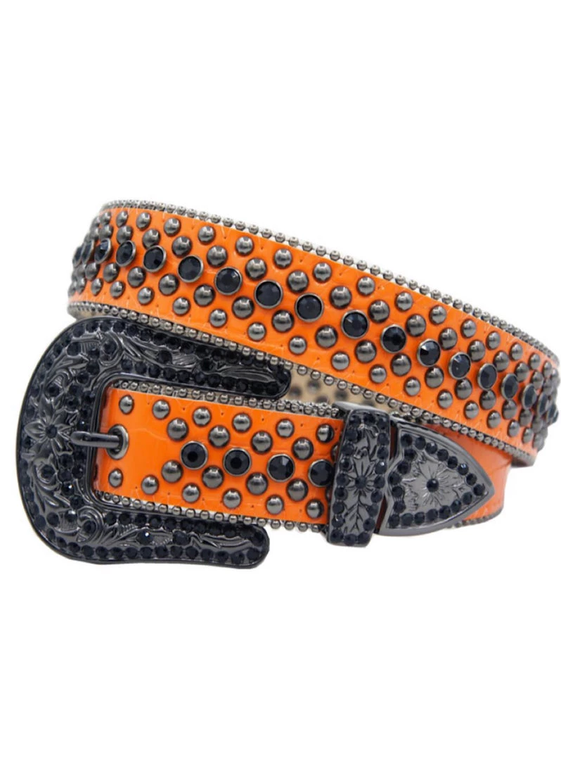 Karma Belt – Stones And Studs – Orange Leather With Black Stones