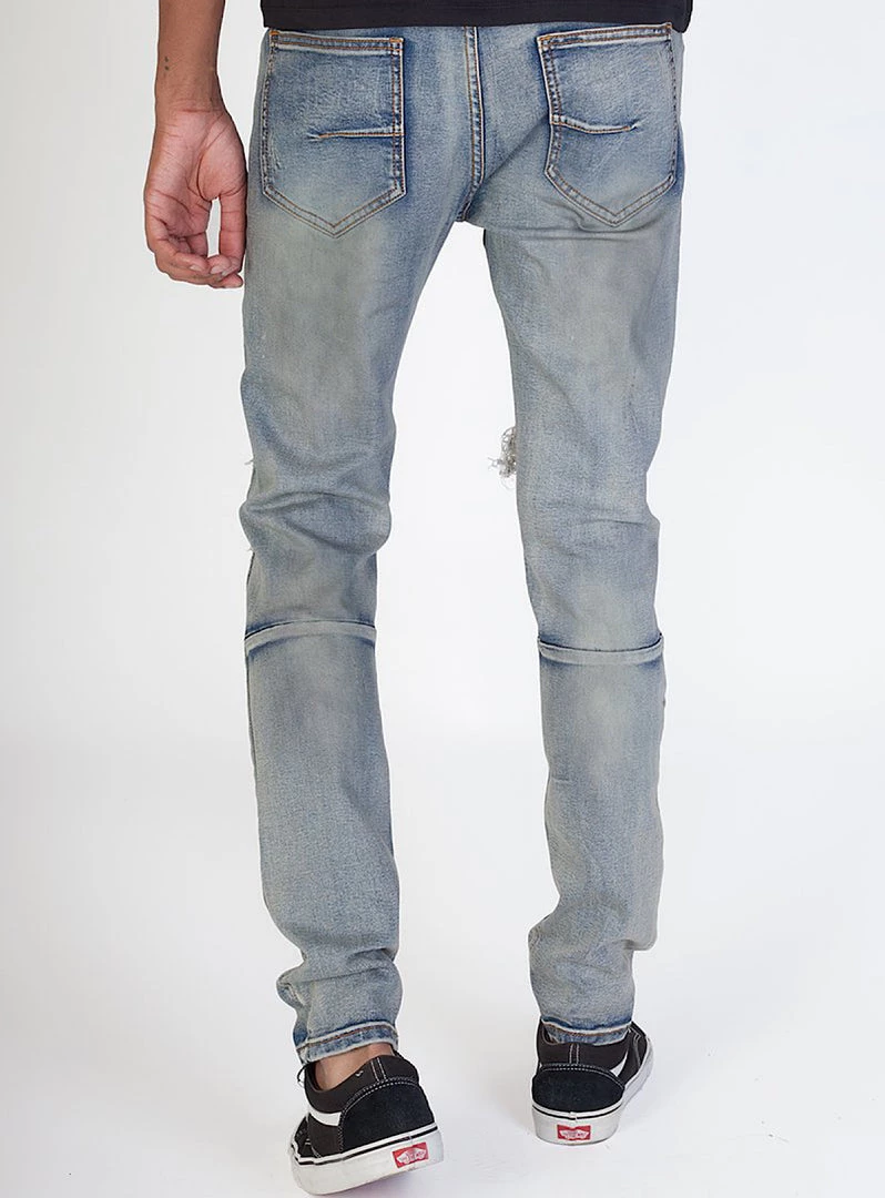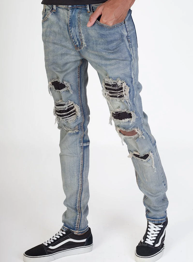 Slim fit jeans, Ripped detail at front leg with black rhinestones. Front and back knee seams with vintage washing.