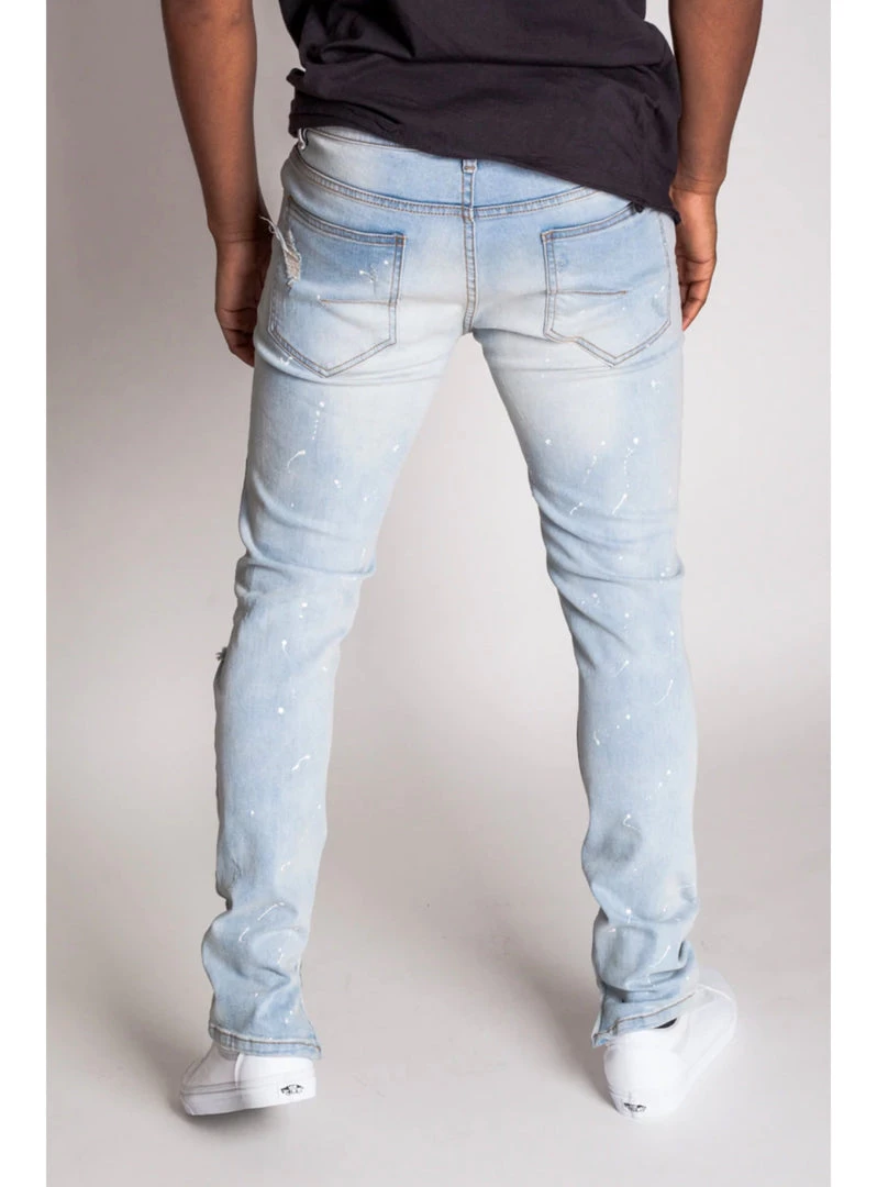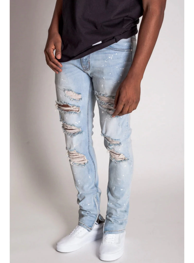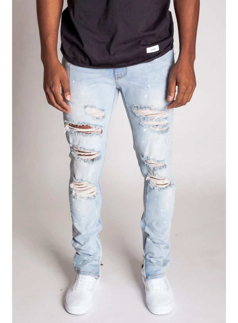 Slim fit jeans, Ripped detail at front leg with a cream colored stripe up the leg and white ribbed detailing.