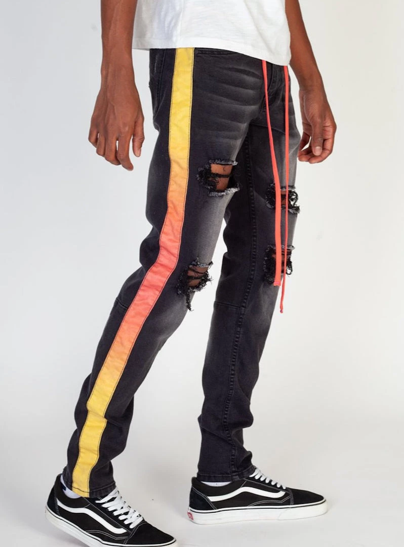 These KDNK Jeans feature 5-Pocket signature skinny jean, Contrast print on outer seams (striped side). Garment stone wash with distressing and whiskers, Zippered fly. Signature D-Ring on belt loop