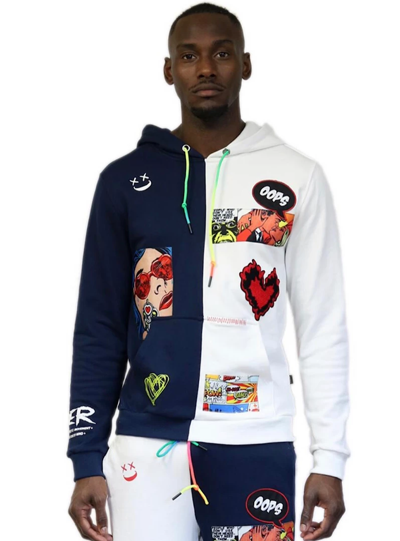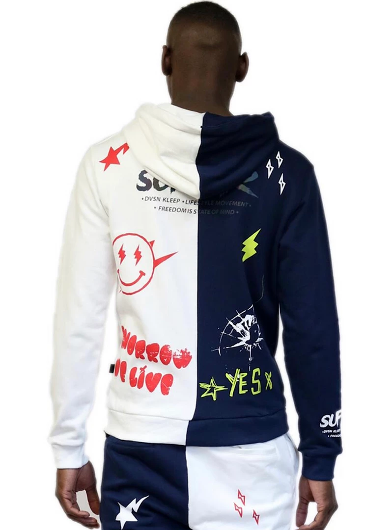 Men’s premium half and half pull over fleece hoody with heavy path works and heavy print effects.