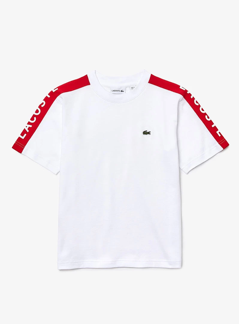 - Contrast bands with Lacoste branding on shoulders and sleeves