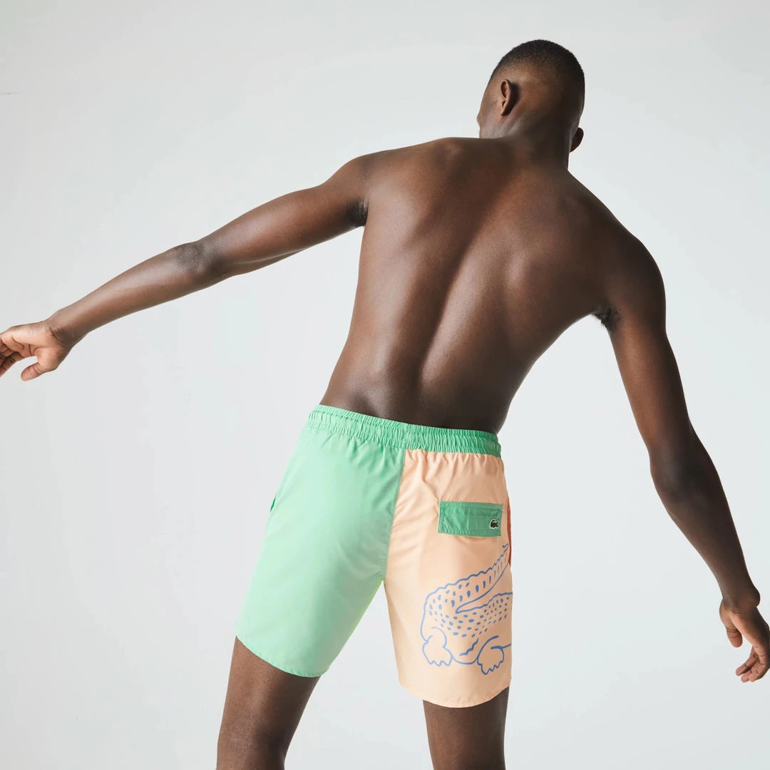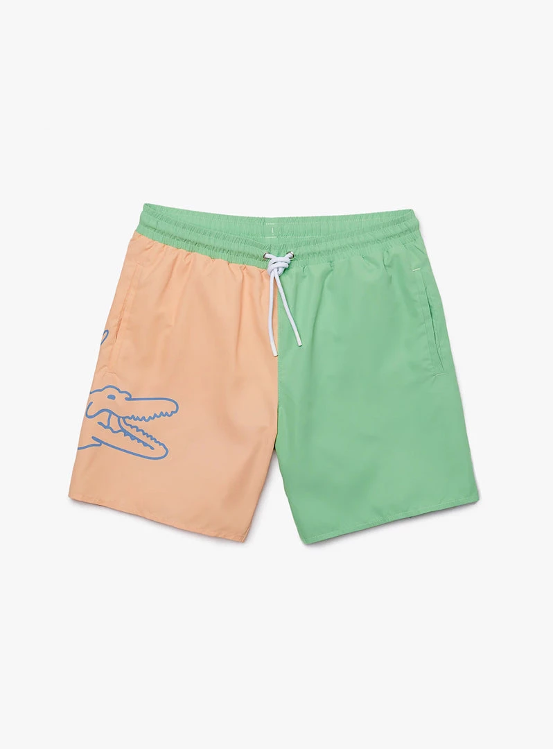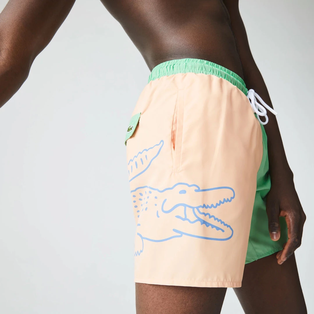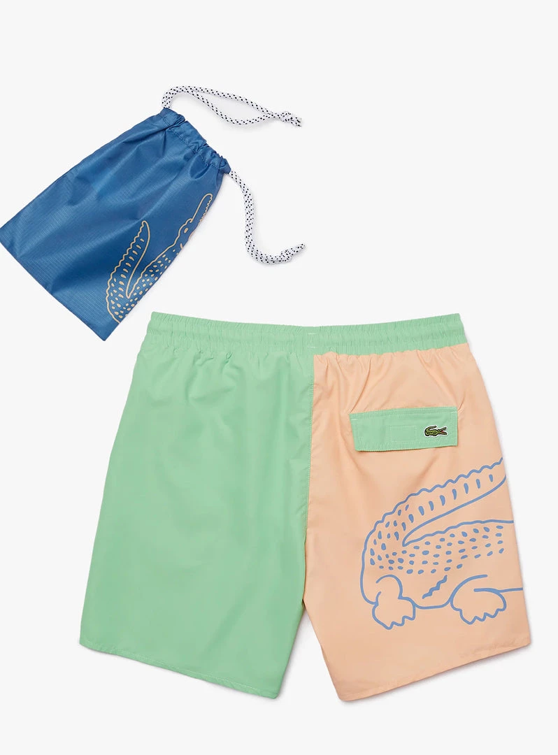 An oversized crocodile design adorns these lightweight swimming trunks crafted in recycled polyester taffeta. Equipped with side pockets and a back flap pocket, this convenient pair features quick-dry properties and comes with a transport pouch. With built-in mesh shorts and an elasticised waistband, these trunks make swimming a breeze.