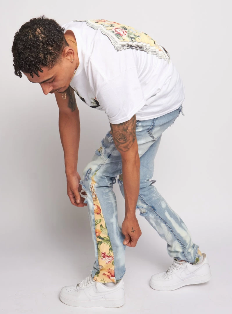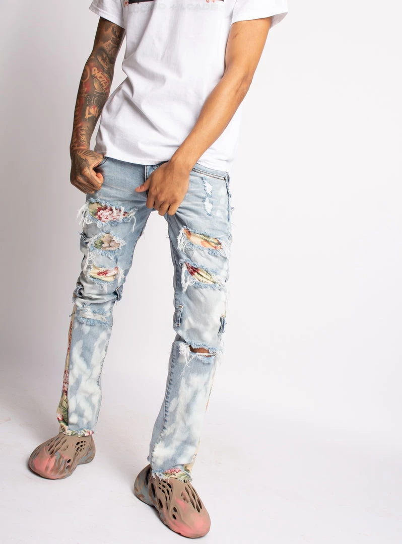 This collection was made in house by the L+L design team. These jeans were hand stitched and altered using recycled materials.