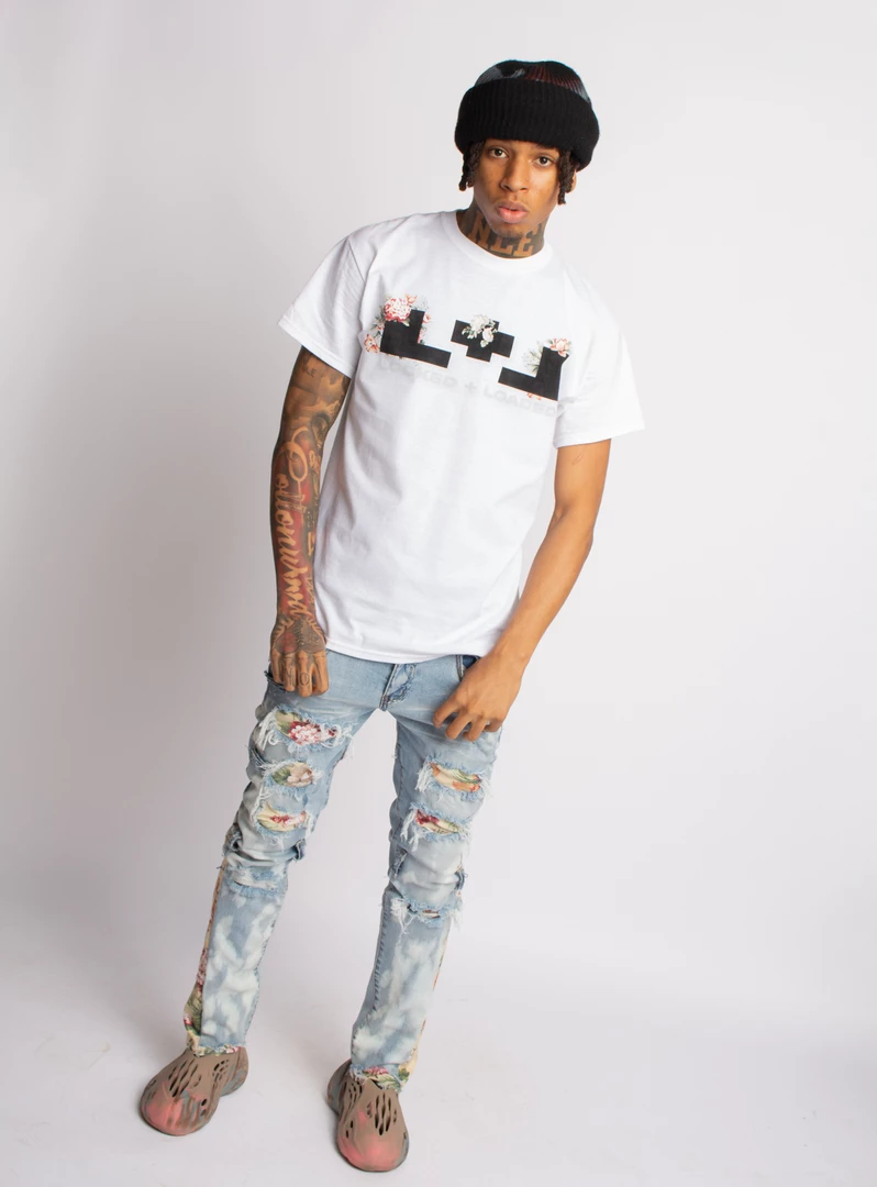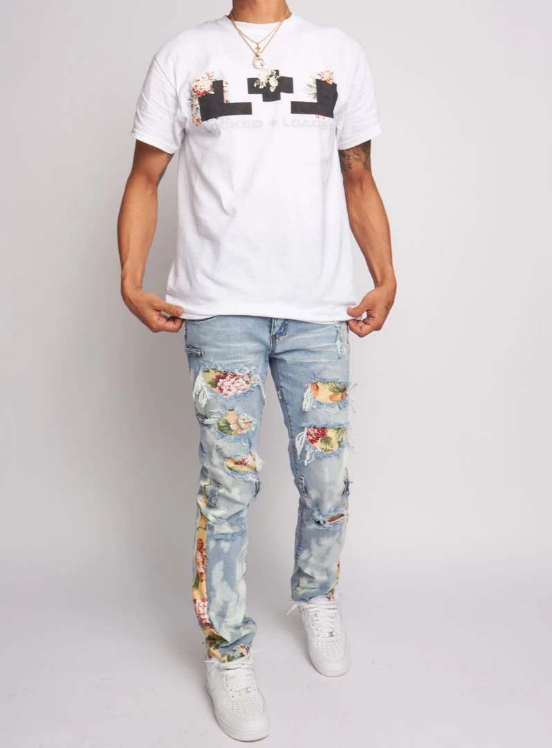 This collection was made in house by the L+L design team. Direct to garmet printed imagery on high quality cotton t-shirts. Designed to match hand made floral jeans.