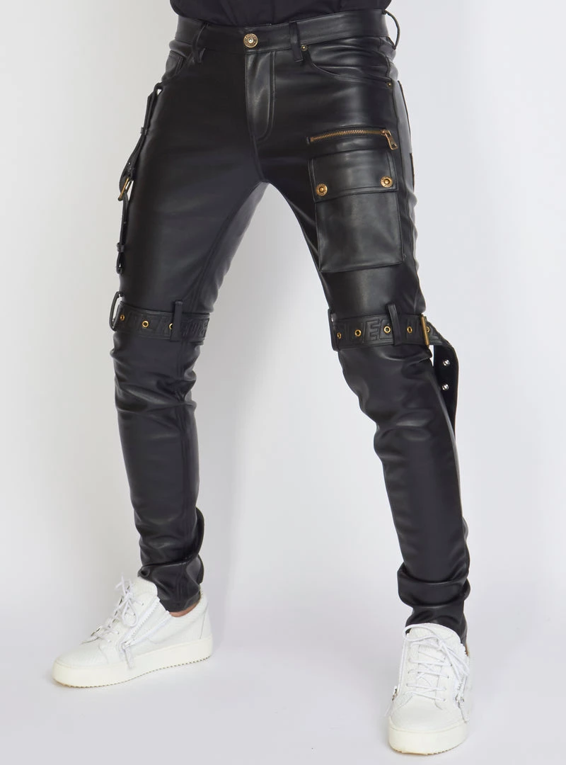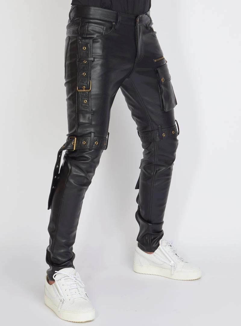 These jeans are made of soft pu leather. Removable straps for limitless variations of wear and functional pocket designs.