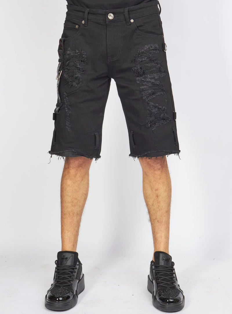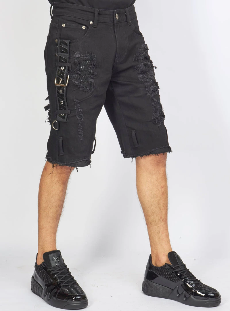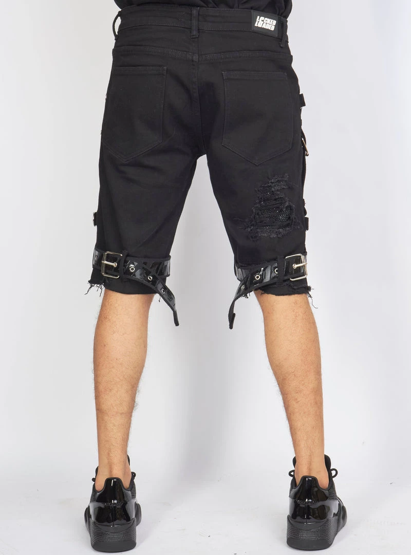 98% Cotton 2% Elastane. Black cotton twill shorts with black straps and crystals. Strapped Denim including lobster clasps for limitless variations for wear.