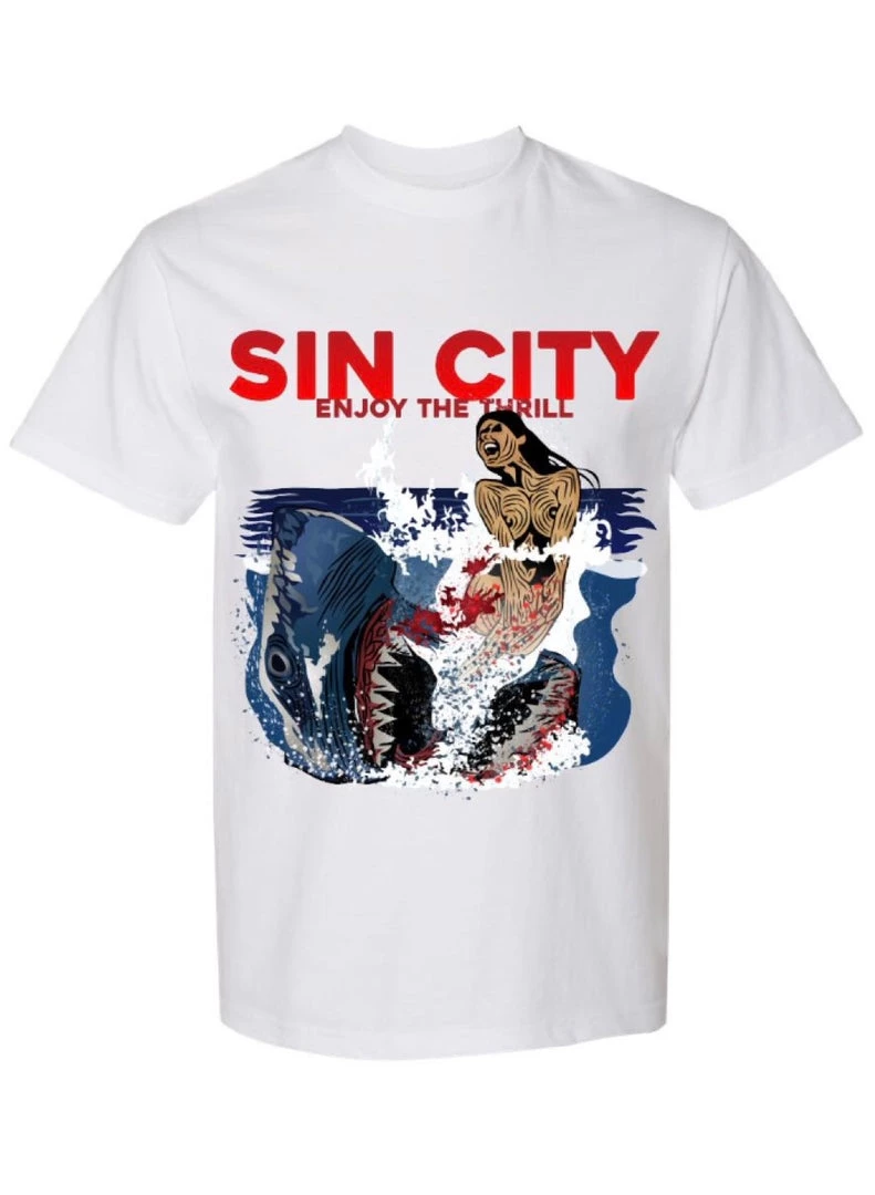 Paradise Falls T-Shirt – Sin City Shark – White Shop All