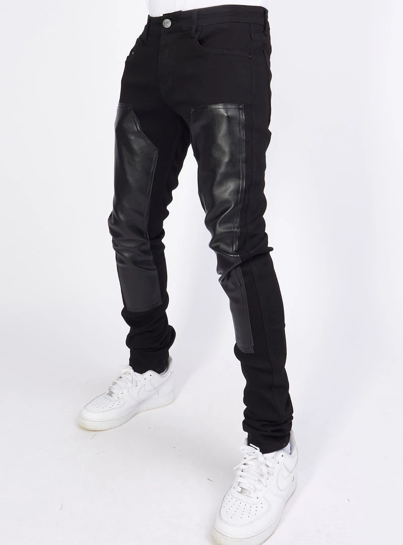 These jeans by Politics are soft, stretchy, and durable. This pair features leather paneling on the front with a slim/skinny fit. Model is 6′ wearing a size 32.