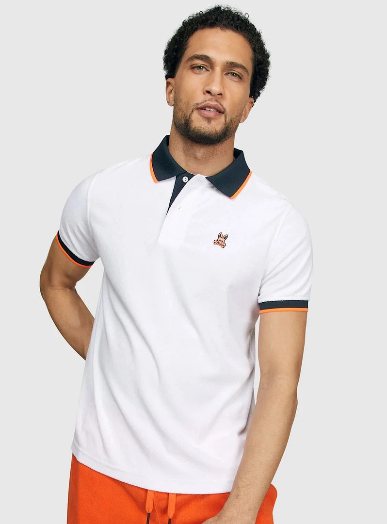 The mens Greyson polo reinvents a classic with a comfortable twist. This polo is crafted from an 80% cotton, 20% polyester toweling terrycloth fabric, making it unbelievably soft and incredibly comfortable. Of course, the Greyson is finished with luxe trimmings, like mother-of-pearl buttons, taped seams, side vents, a collar that never rolls and an embroidered logo created using more than 4,000 stitches. The Greyson is cut a little bit longer than the average polo, with a trim fit that hits the sweet spot between classic and slim. This polo is finished with tipped contrast cuffs and a matching collar, crafted from 100% Pima cotton.