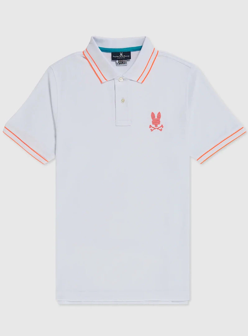 The Ian polo puts an irreverent twist on a classic. Crafted to lofty standards using only the softest Pima cotton, this polo is finished with luxe trimmings: mother-of-pearl buttons, taped seams, side vents, and a collar that never rolls. The Ian is cut a little bit longer than the average polo, with a trim fit that hits the sweet spot between classic and slim. Taped seams in the shoulders and a unique diamond knit piqué ensure it never loses that perfect fit. The Ian polo features contrast tipping on the cuffs and collar, which flank meticulous herringbone knit sections. This polo is finished with a unique, linear take on Psycho Bunny’s logo, embroidered on the left chest.