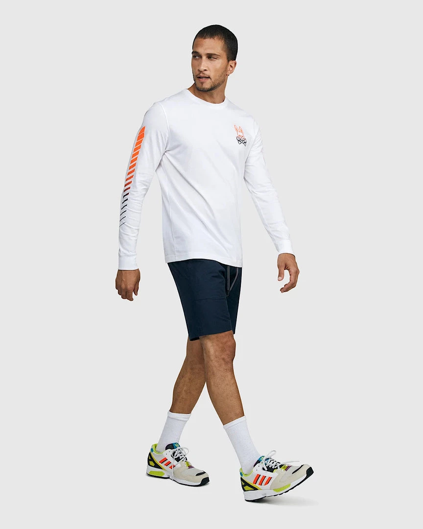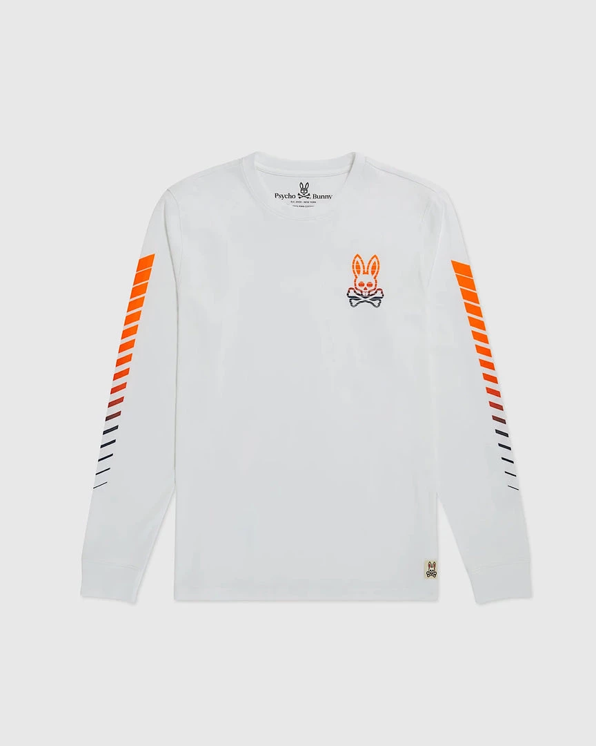 Our mens Egremont long sleeve graphic tee will have you looking sharp this fall. Crafted from only the softest Pima cotton, the Egremont’s trim fit hits the sweet spot between classic and slim. Taped seams in the shoulders and ribbing on the cuffs ensure it never loses that perfect fit. The Egremont is finished with a bold chest graphic and vibrant gradient stripes down the sleeves, making this the ultimate statement tee.