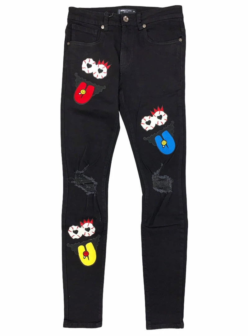 These jeans are premium quality and have a unique eyes design. They are made of 100% cotton material. They are slim fit and they fit true to size. It was designed in the USA.