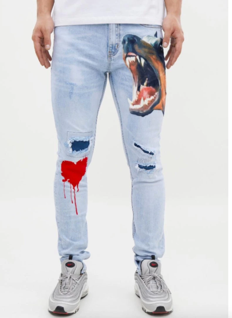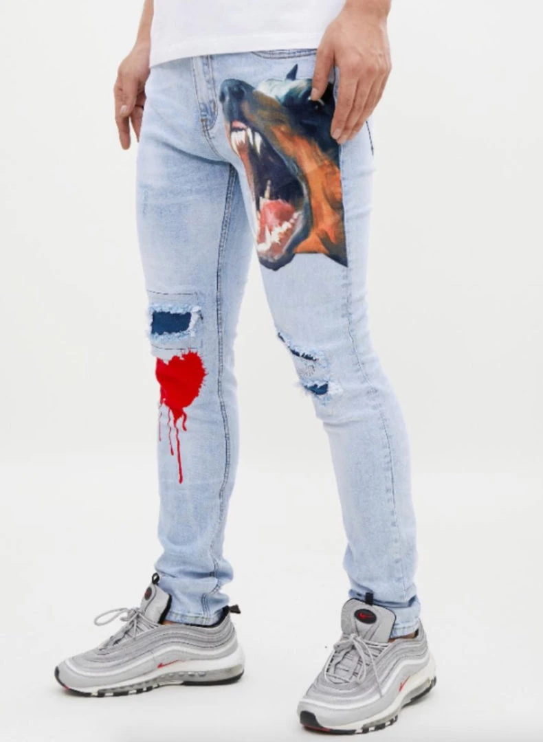 These jeans are premium quality and have a unique eyes design. They are made of 100% cotton material. They are slim fit and they fit true to size. It was designed in the USA.