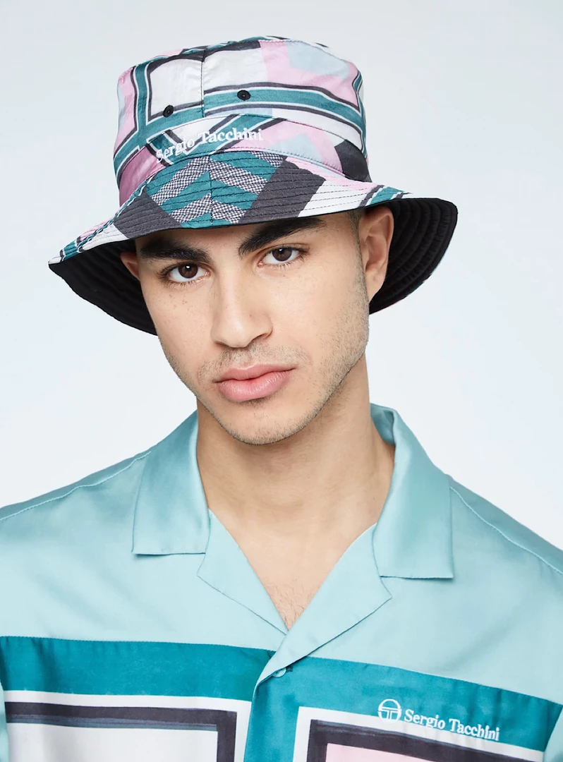 - 100% polyester Crepe de Chine 90gsm with all-over abstract geometric pattern w/ embroidered Sergio Tacchini wordmark logo