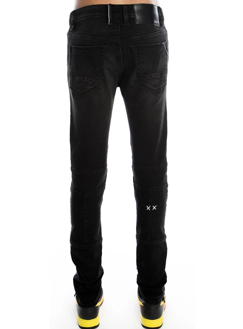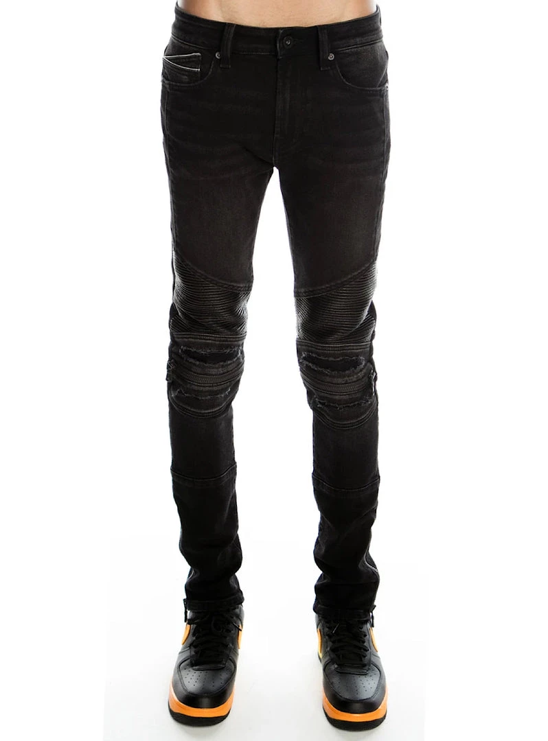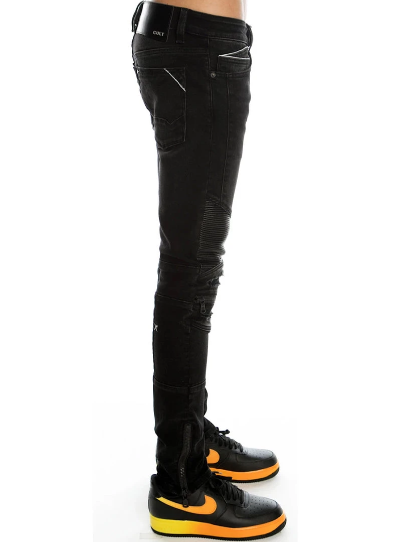 This black punk super skinny moto style has a narrow leg from thigh to ankle. Crafted from a premium stretch denim with vegan leather pleated panels and zippers at the knee for a clean design.