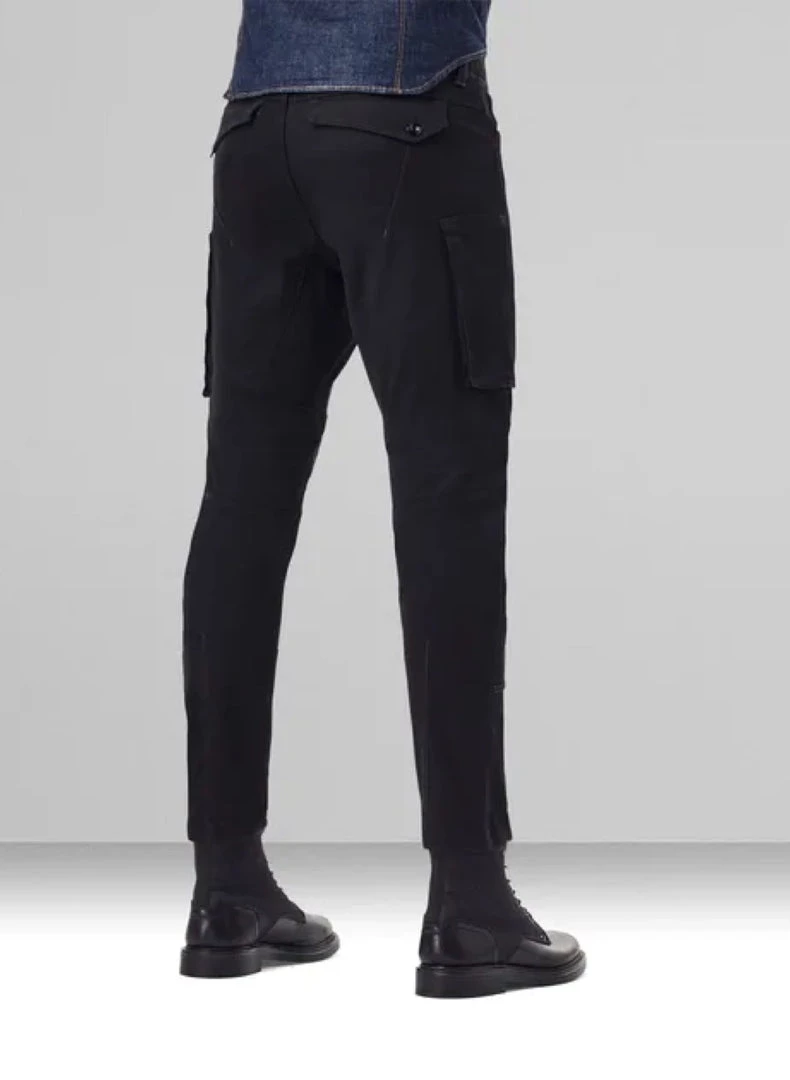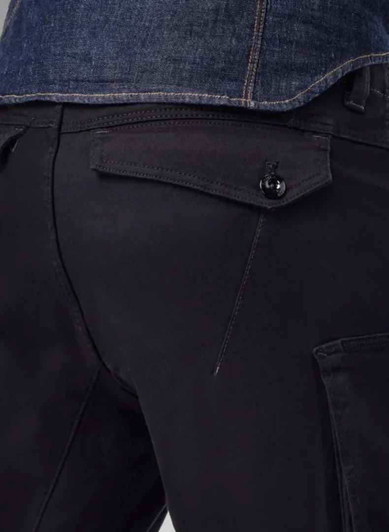 These skinny Cargo Pants offer 3D patched on pockets with a concealed zipper along the side. Woven tape is applied at the entrance of the inset pockets. Also at the backside pockets are created. These show a flap and button closure. Diagonal seams below give additional shaping to the backside.