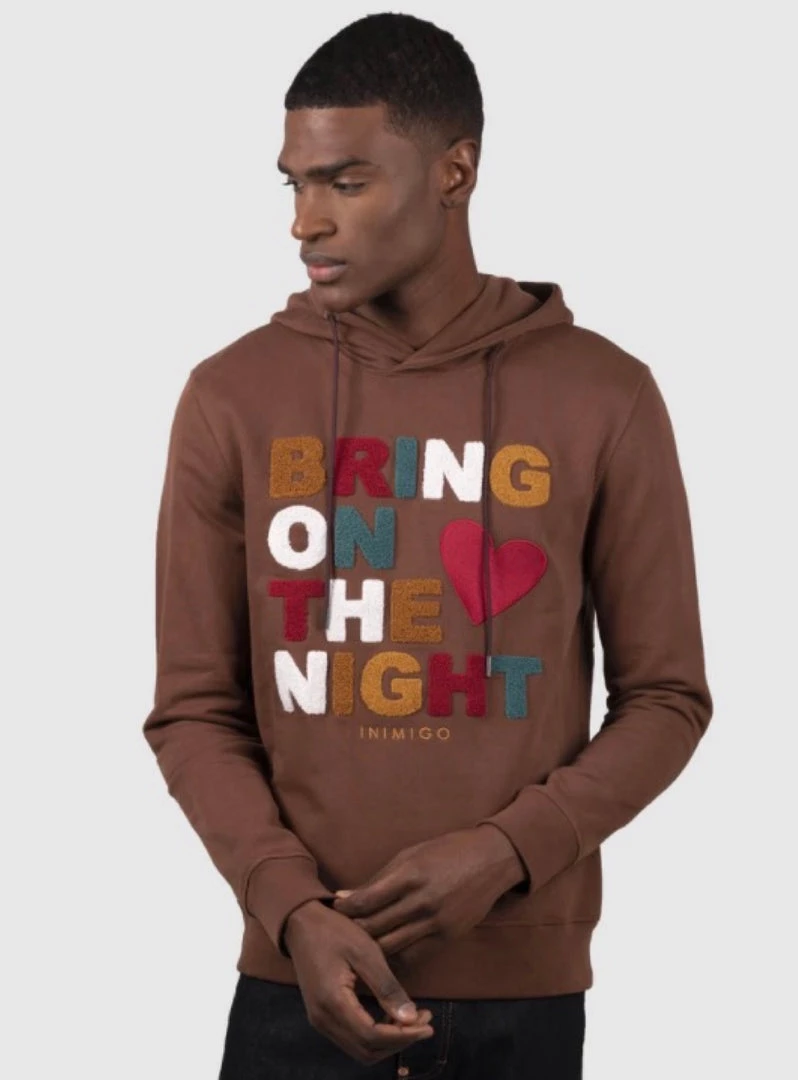 Hoodie Bring On The Night was inspired by the crazy 80s disco club parties for mystical celebrities and yuppies. This print is a combination between digital print and high-density. Article made in 100% Organic Cotton, with the INIMIGO logo engraved on a metal plaque and hand-stitched on the chest. A perfect fit, always with character.