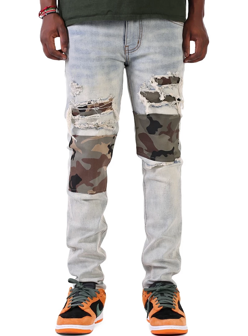 Slim fit jeans, Ripped detail at front leg with a cream colored stripe up the leg and white ribbed detailing.