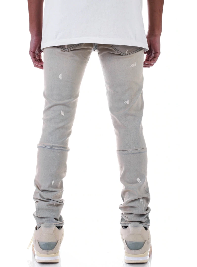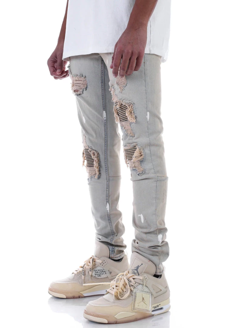 Slim fit jeans, Ripped detail at front leg with a cream colored stripe up the leg and white ribbed detailing.