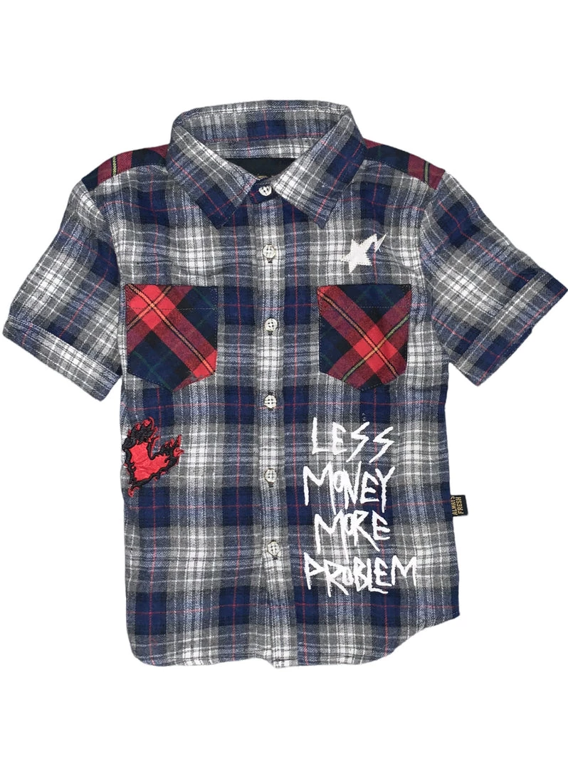 Kids premium short sleeve flannel & twill shirt with heavy print effect and patchworks.
