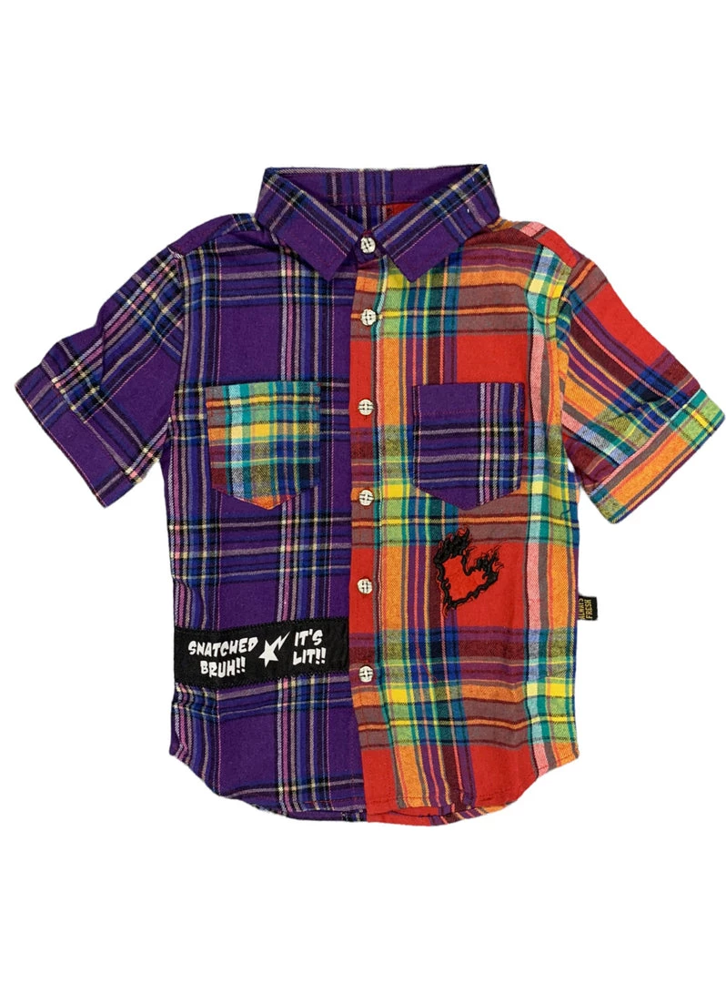 Kids premium short sleeve flannel & twill shirt with heavy print effect and patchworks.