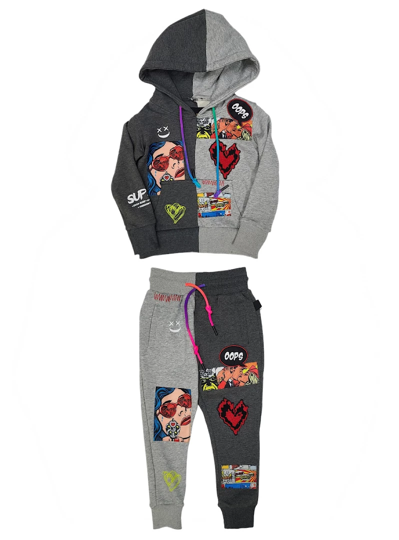 Kid’s premium half and half pull over fleece hoody and pants with heavy patch works works and heavy print effects.