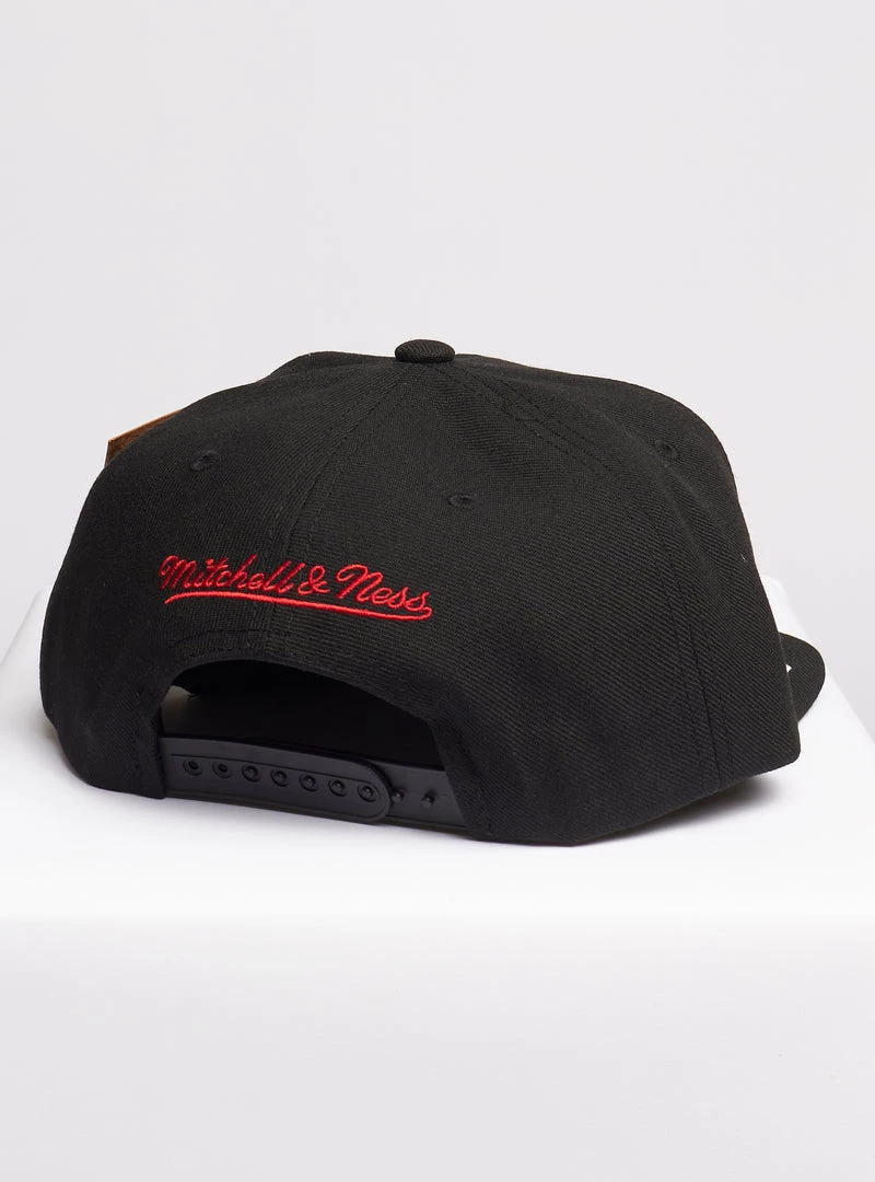 Mitchell & Ness Original Fit Snapback profile with a high structured crown and small, flat visor. Stitched eyelets for breathability. Interior includes branded taping as well as a moisture absorbing sweatband. A snapback closure for an adjustable fit.
