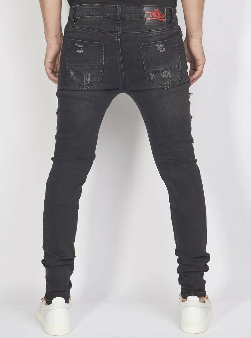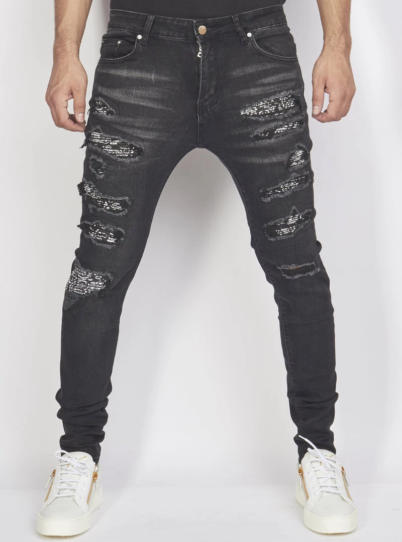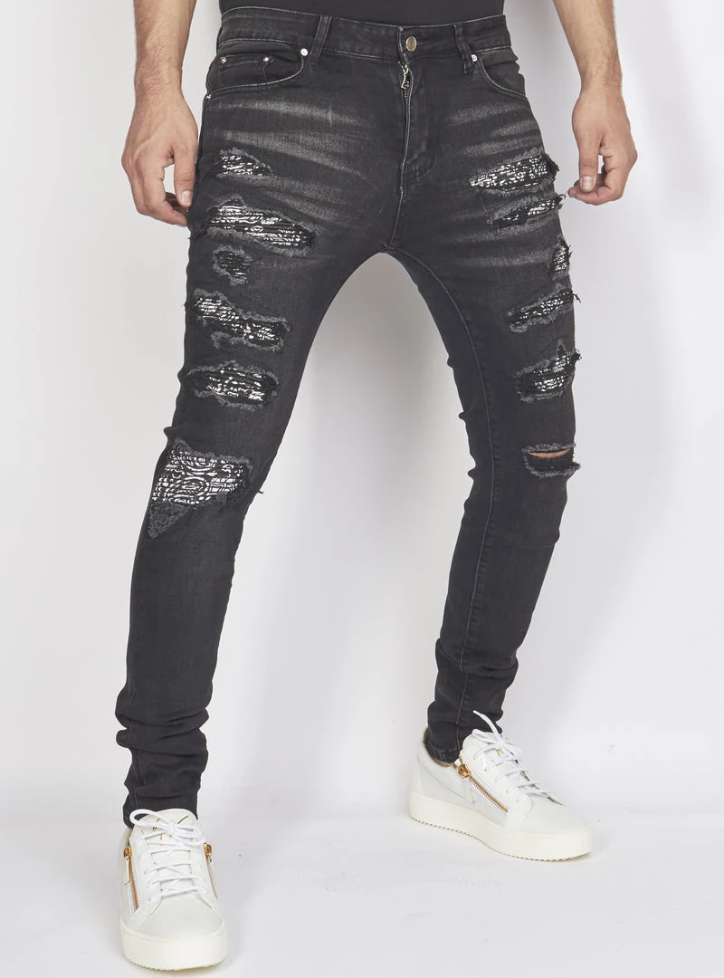 Shop All Politics Jeans – Distressed With Paisley Ribbing – Black With White – PLTKS0521669