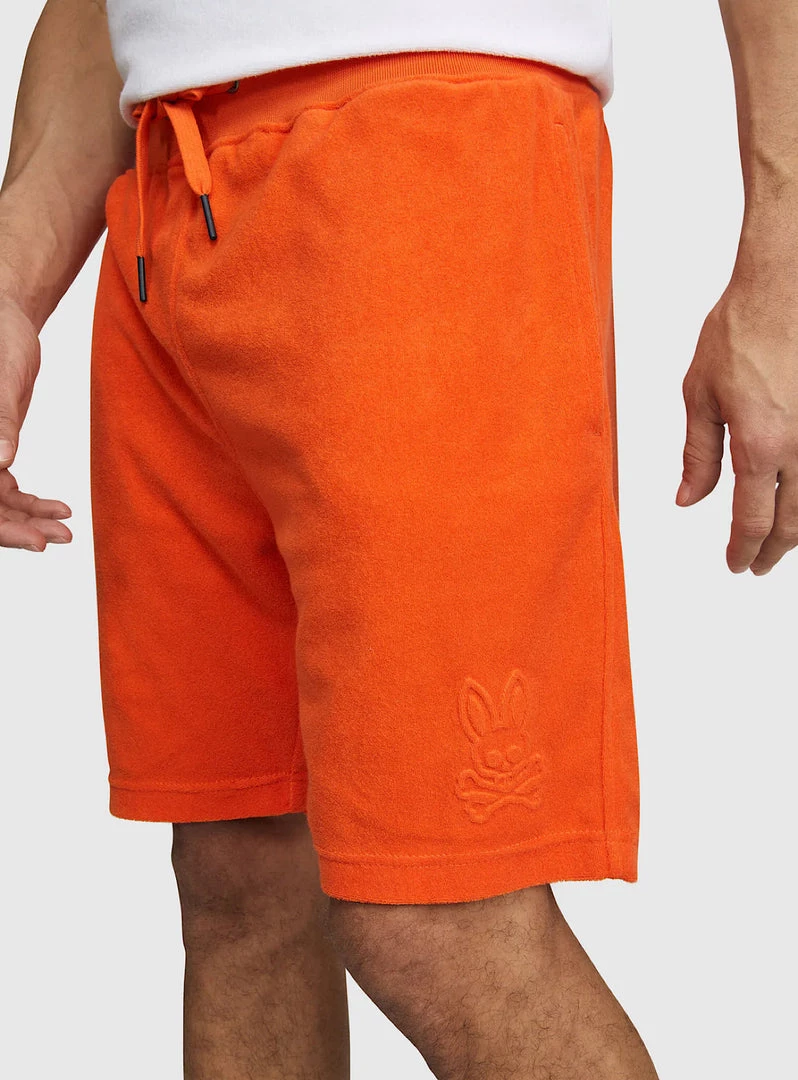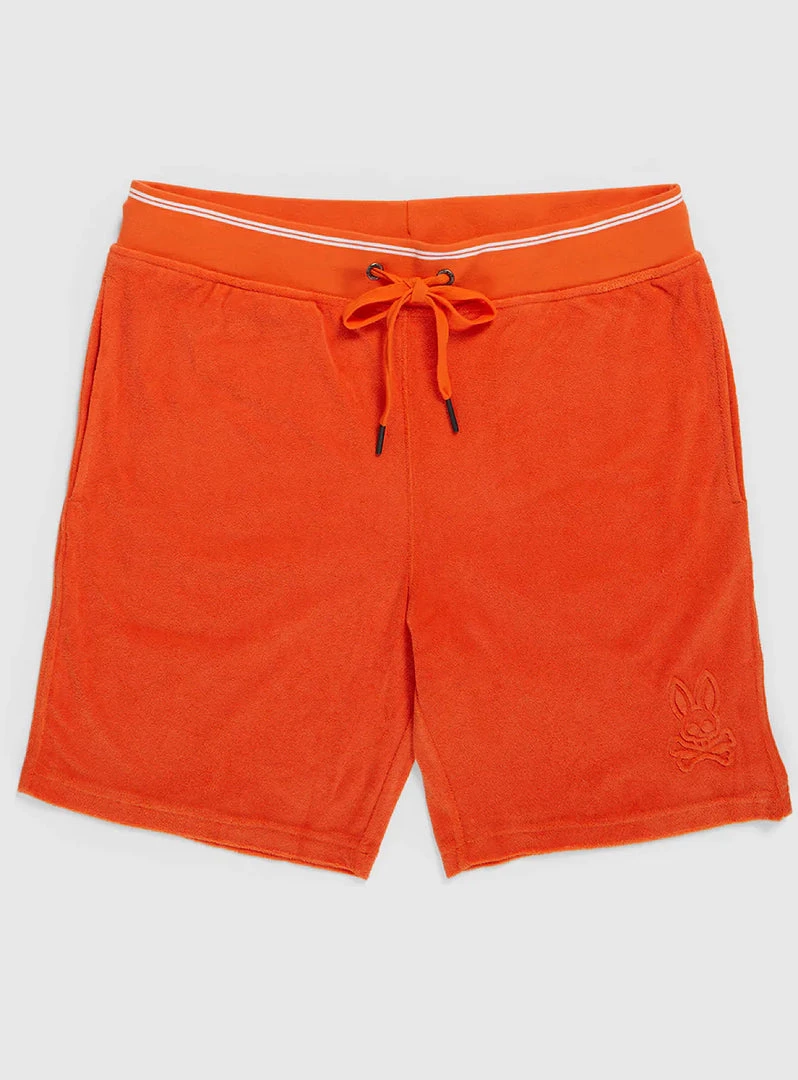 The Greyson terry sweat shorts are sure to stand apart. Crafted to lofty standards from a cotton-polyester terrycloth, these shorts offer an incredibly soft on-body feel. The Greyson sweat shorts feature rubber-tipped drawstrings at the waist, two slash pockets at the hips and a zippered pocket at the rear. These shorts are finished with contrast tipping along the ribbed waistband, as well as a tonal Psycho Bunny logo on the left thigh.