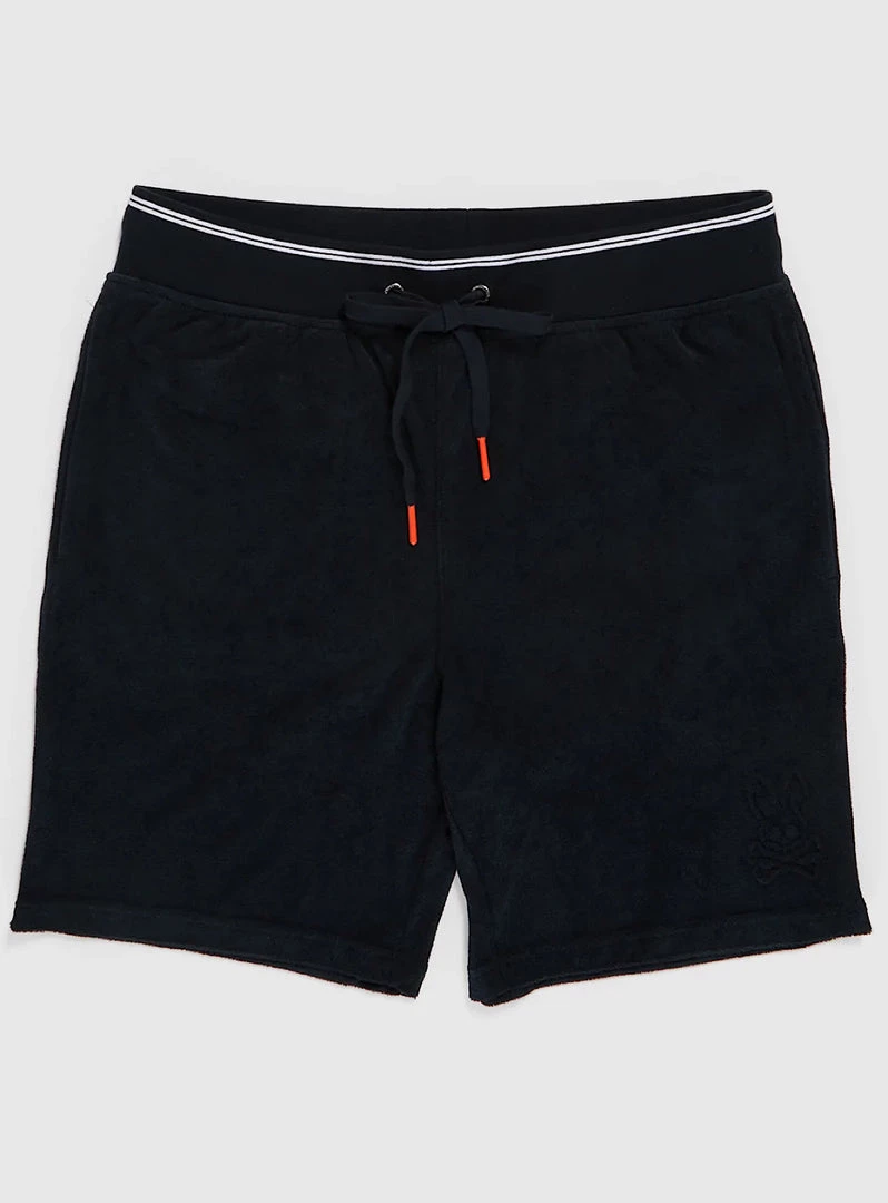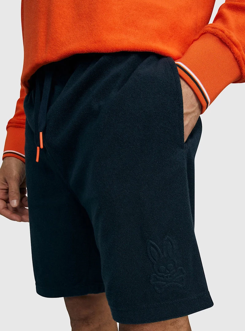 The Greyson terry sweat shorts are sure to stand apart. Crafted to lofty standards from a cotton-polyester terrycloth, these shorts offer an incredibly soft on-body feel. The Greyson sweat shorts feature rubber-tipped drawstrings at the waist, two slash pockets at the hips and a zippered pocket at the rear. These shorts are finished with contrast tipping along the ribbed waistband, as well as a tonal Psycho Bunny logo on the left thigh.