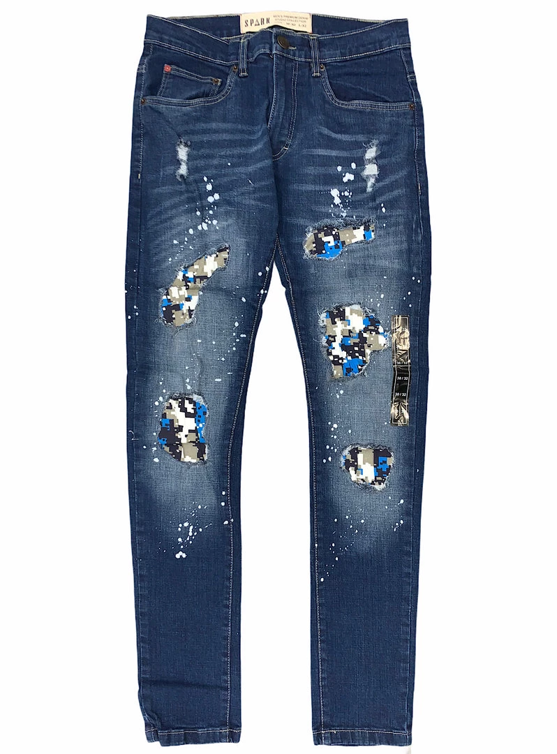 Spark Denim Jeans – Ripped With Splatter And Patch – Dark Blue – S11090-DB Shop All